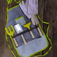 The apron set includes a sturdy cotton apron and real wooden handled tools sized for little hands, ideal for digging, planting and getting properly muddy.