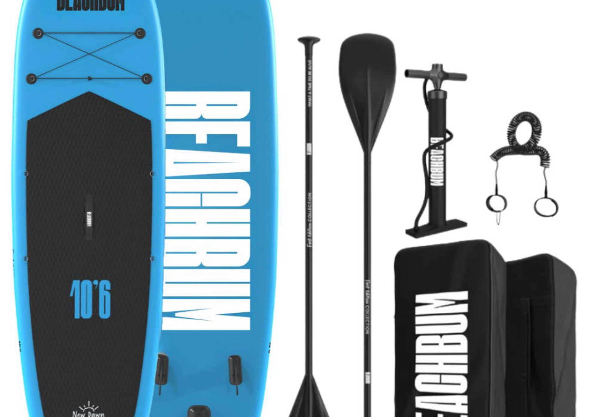 This kit includes everything you need to become a SUP pro: 3 piece aluminium paddle, double action hand pump, gauge to measure the pressure, safety leash, 3 fins, repair kit and transportable rucksack that fits everything inside.